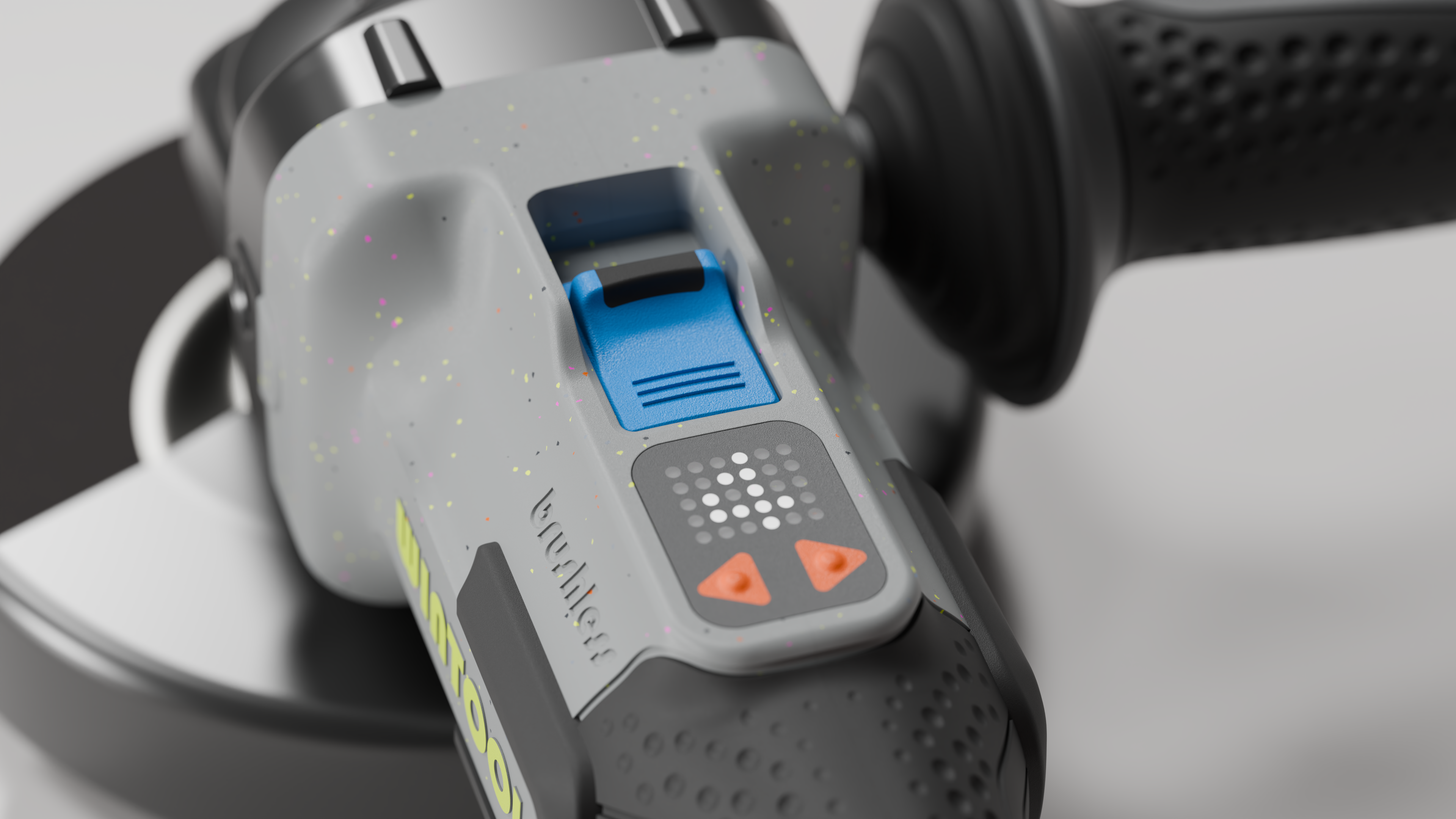 Every element in this collection is carefully considered to make sure the tools feel like a family. The balance between light gray, black, and bright accent colors creates a unified look. The colorful details – the pink vents, neon yellow-green logos, and hot orange speed selector arrows – not only make the tools visually interesting but also help guide the user intuitively. It’s a design that’s cohesive but never dull, with each part adding something to the whole.